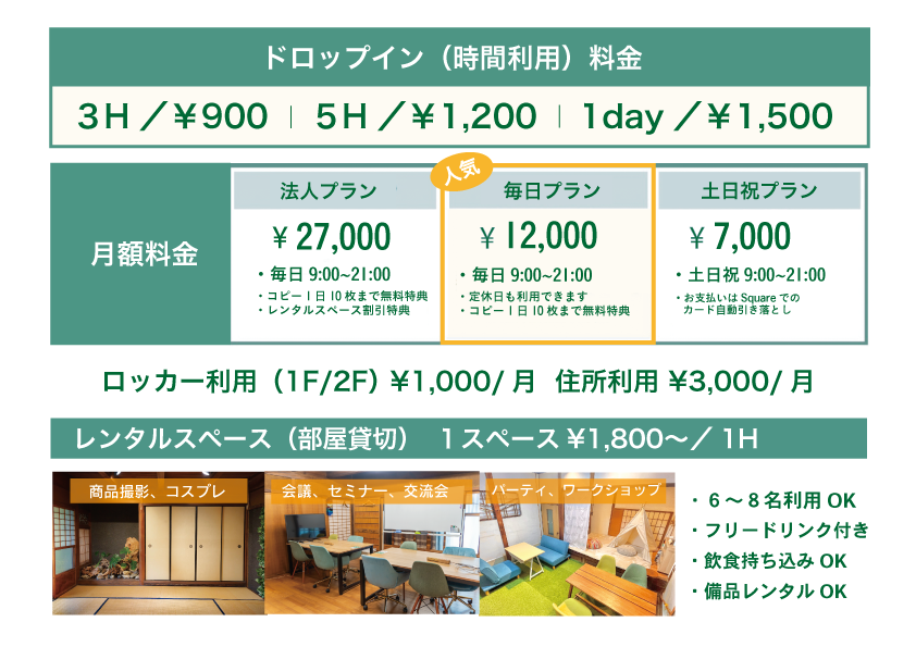 利用プランでは予約不要でいつでも気軽に来られる「ドロップイン(時間利用)」が1day ¥1,500、また毎日使いたい、特定の曜日時間だけ使いたい方向けの月額プランもご用意しております。