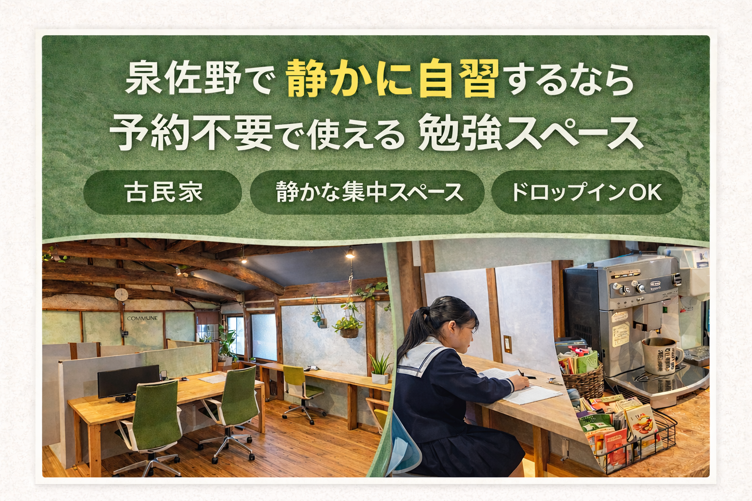 泉佐野駅から早歩き6分の古民家コワーキングスペースCOMMUNEは、静かな環境で集中して自習したい方におすすめの場所です。