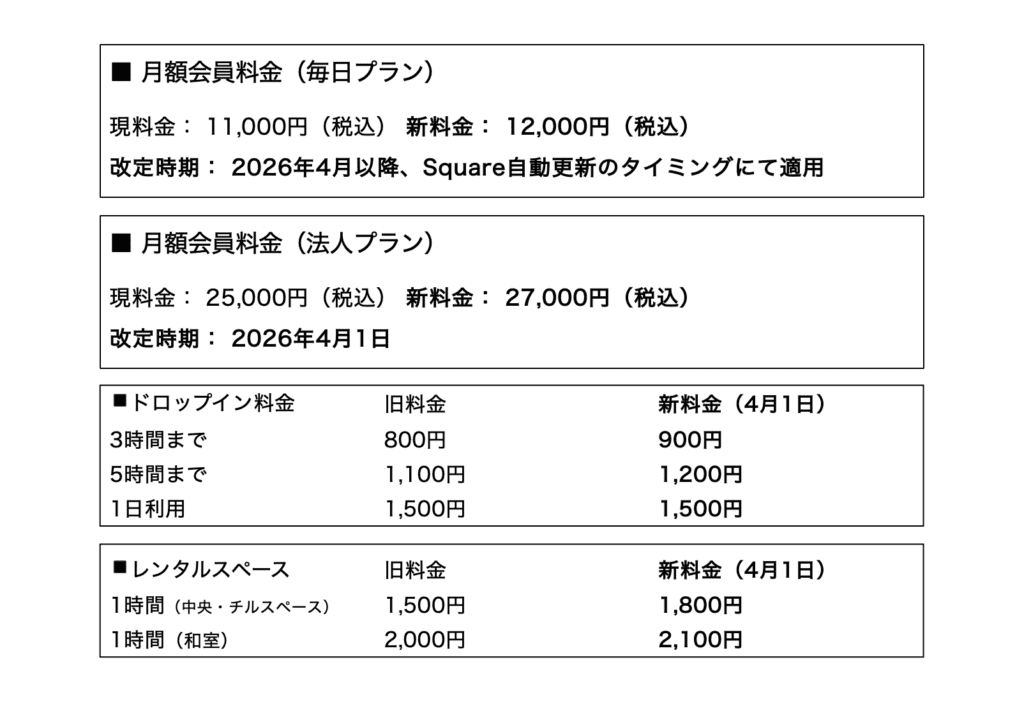 これまで可能な限り料金を据え置いてきましたが、今後もCOMMUNEを“無理なく、長く続けていく場”にするために、サービスの維持と向上を目的とし、誠に心苦しいながら、以下の通り一部料金を改定させていただくこととしました。